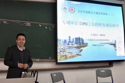 2018年1月11日星期四上午9:00-11:00,百富策略bfball手机版实践教学周财会专题系列讲座的第二场“专项审计及IPO上市的财务规范”在教学楼C208教室举行。本次财经讲座论坛,学院邀请到广东诚安信会计师事务所所长主管合伙人谢园保先生,以及上市公司金逸影城财务总监曾凡清先生,百富策略bfball手机版刘慧芬老师主持本次讲座。