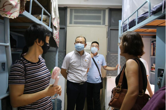 晚上八点,学院党委书记黎冬、党委副书记杜焕君、副院长蒋基及辅导员周雅颂、陈瑶、张亦舒来到学生宿舍,走访慰问2019级本科学生及研究生。“你们从哪里回来”“被子都晒过了吗”,黎书记和蒋副院长十分关心学生返校后的情况,耐心解答了学生们提出的问题,叮嘱学生坚持上报身体状况,科学做好个人常态化健康防护。得知个别宿舍没有冷气供应,杜焕君书记立即与学校有关部门反映情况,并表示遇到什么困难与问题都可以及时联系辅导员老师,学院一定会为同学们的学习生活提供全面保障。